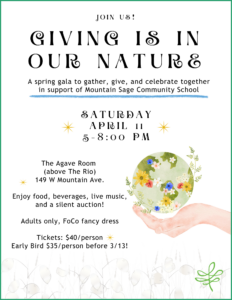 Please join us for the Annual Community Update on Monday, March 9th from 6:30-7:30pm, hosted by the Mountain Sage Board of Directors. We will provide space and time for questions, comments, and input from you to help influence the direction of the work of the board for this year and beyond. This is a virtual-only event in the school Zoom room. Questions that you would like addressed during the event should be emailed to [email protected] no later than 5pm on Wednesday, March 4th.